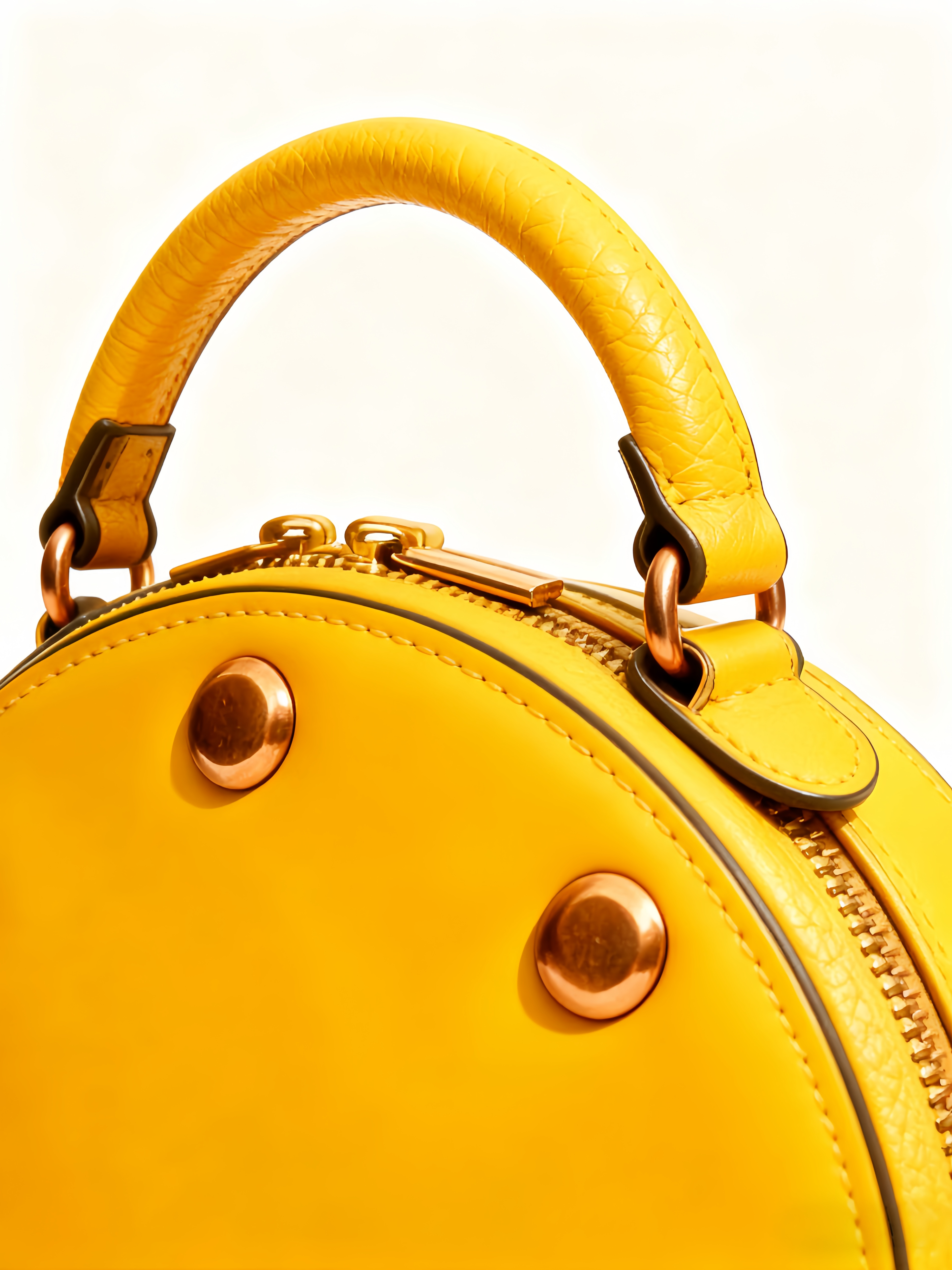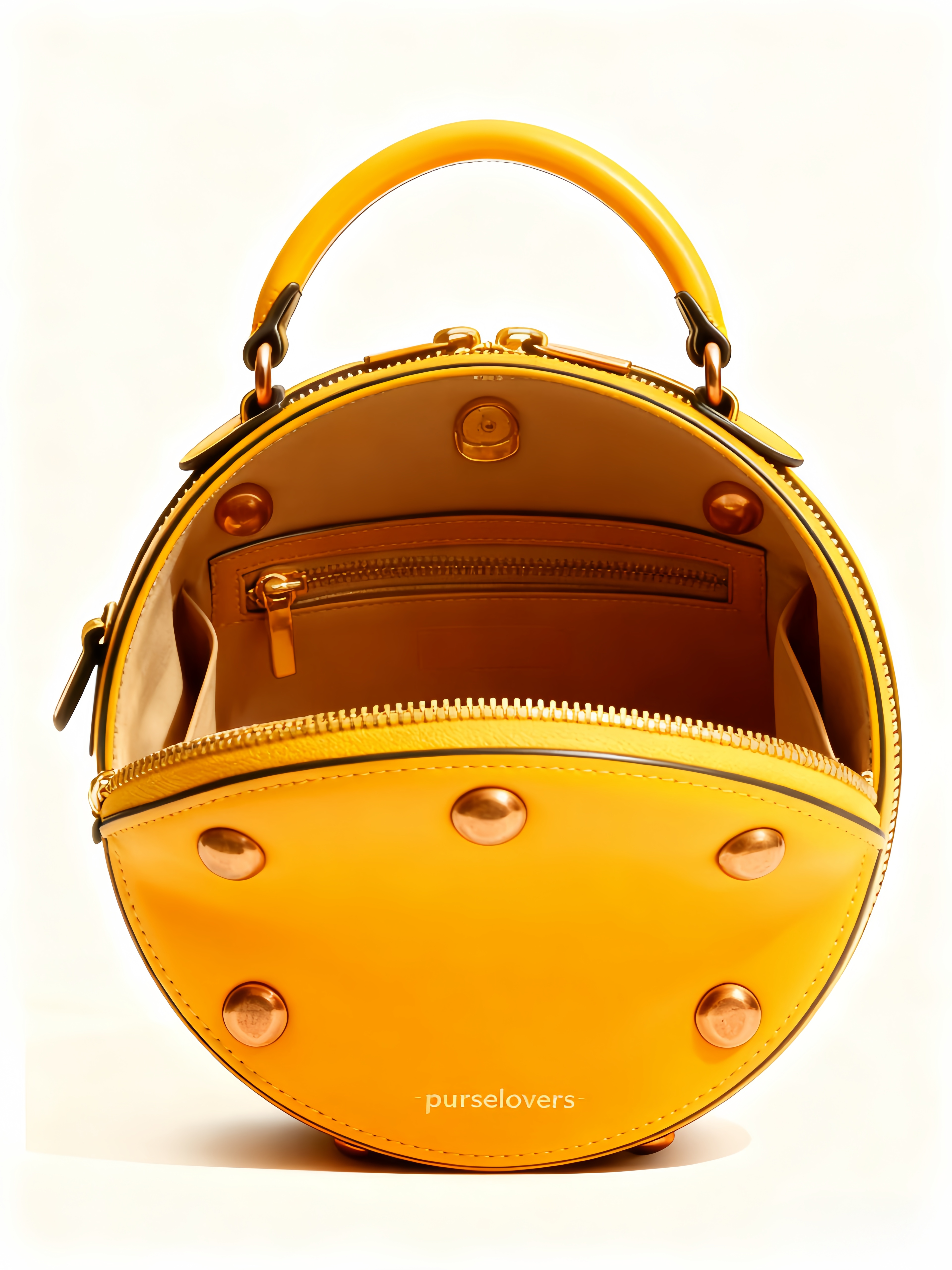 The vibrant lemon yellow, like midday sunlight, cascades over the rounded, disc-shaped bag. Cool-toned metal studs are scattered like stars, creating a striking visual impact. Made from select supple calfskin with a special coating, it boasts a bright color and is durable and practical. The elegantly curved leather handle at the top and a detachable chain hidden on the side allow for easy transition between hand-carrying and crossbody wear. The interior design continues the exterior's vibrancy and order, with a zippered pocket and card slots to neatly organize your essentials.